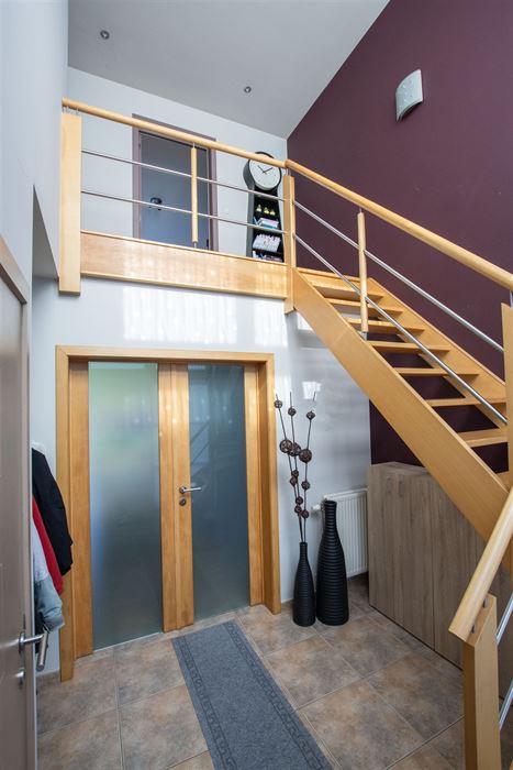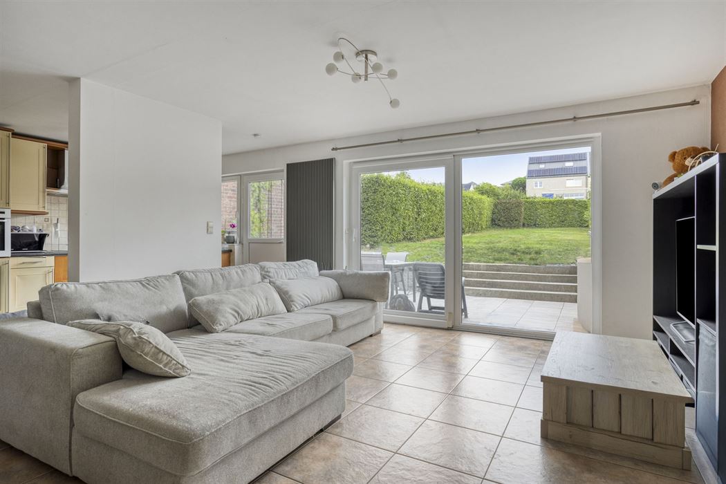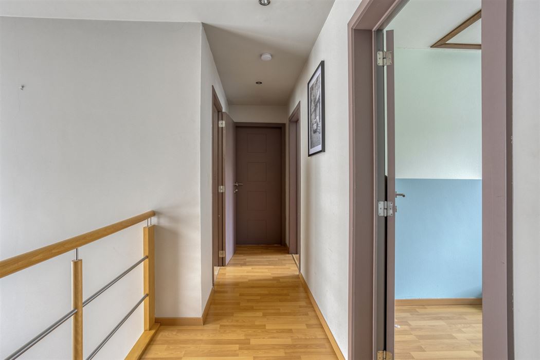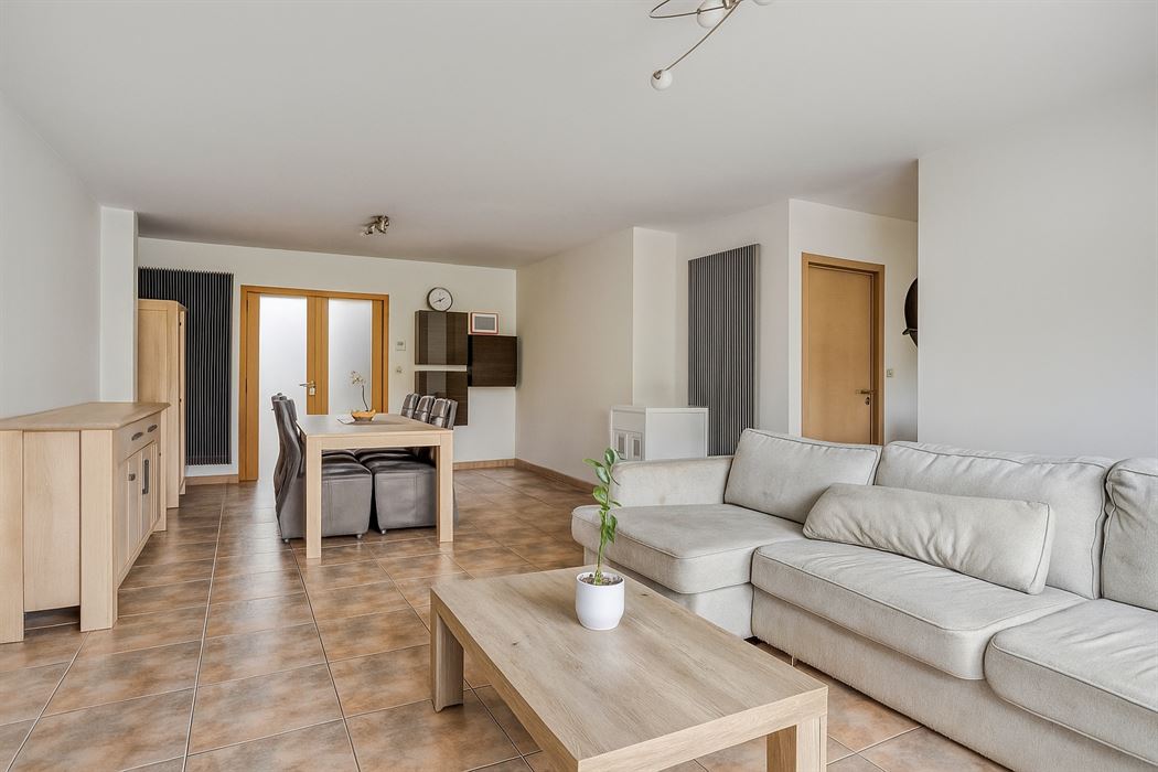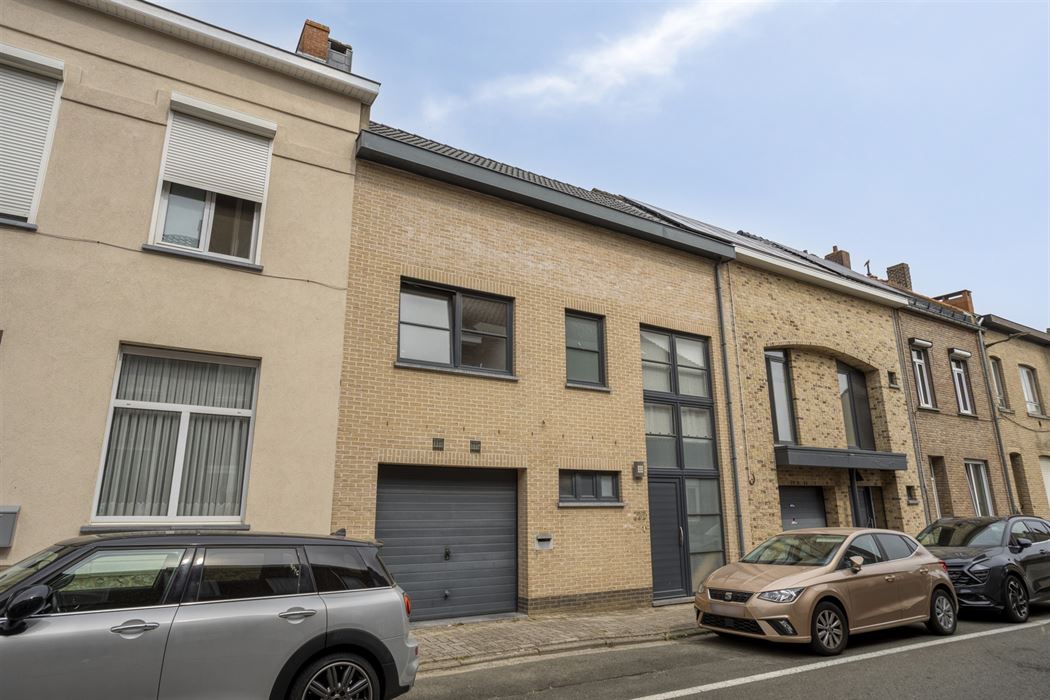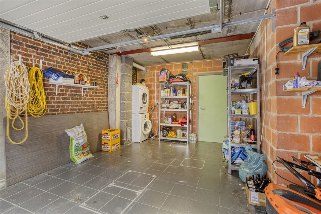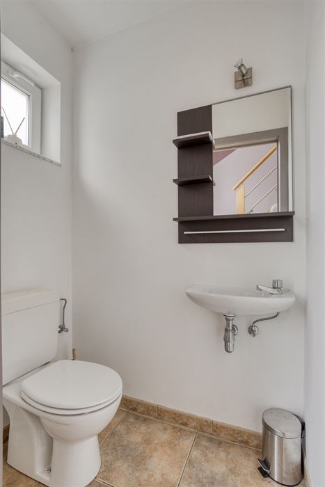 Gelijkvloers: lichtrijke inkomhal met wc, woonkamer met open ingerichte keuken. Berging en garage.