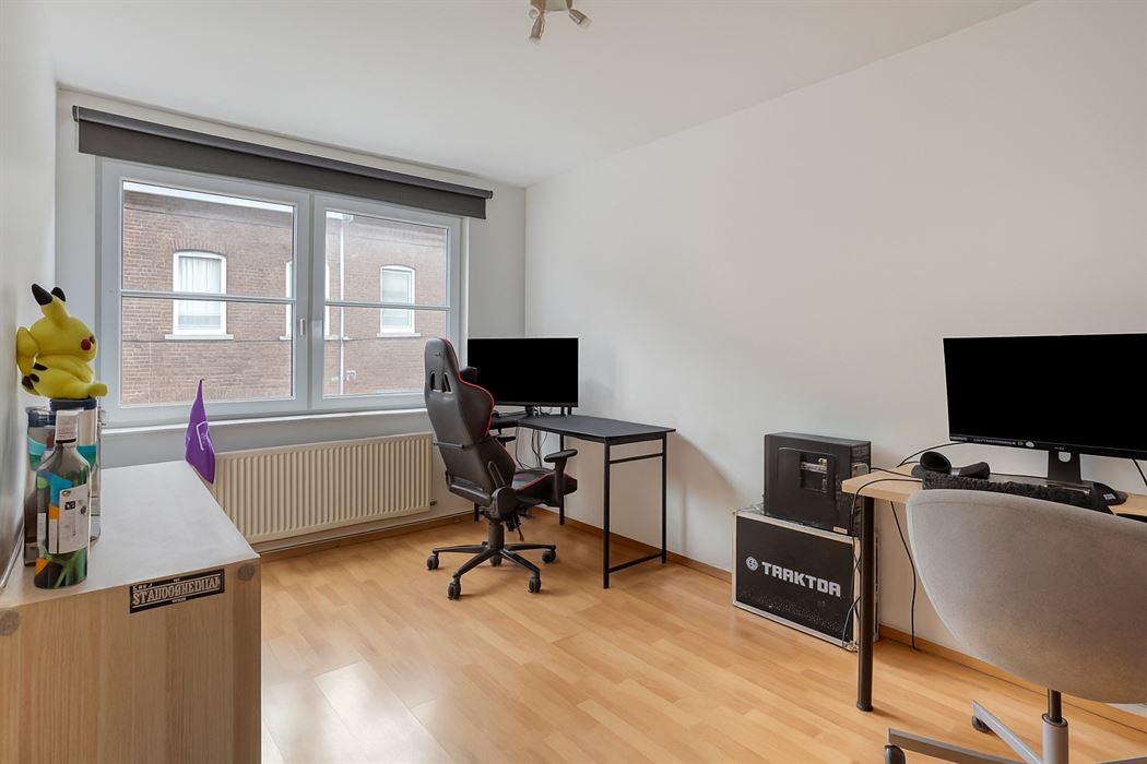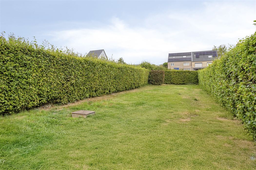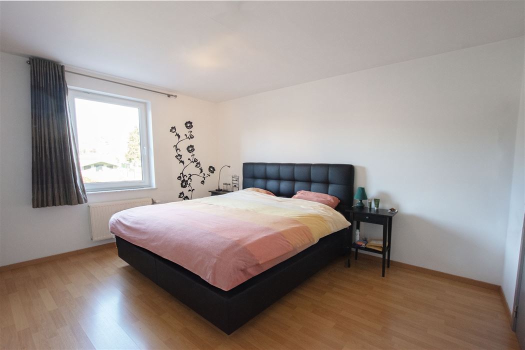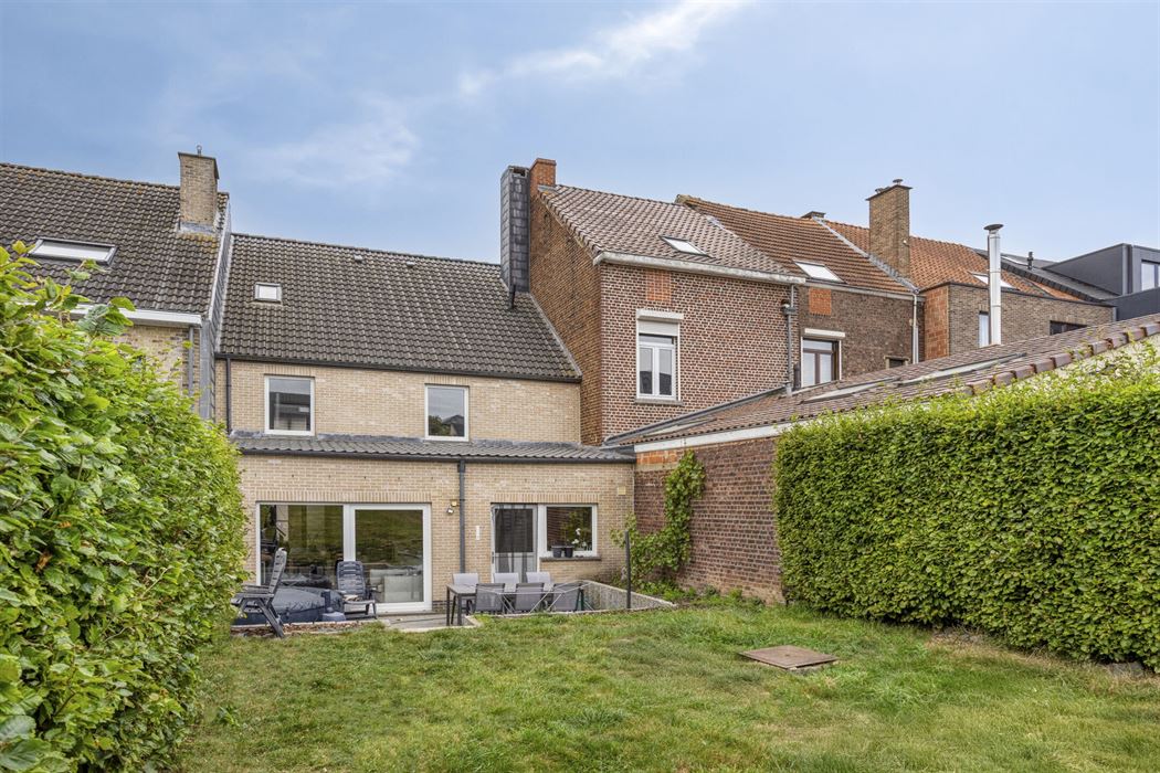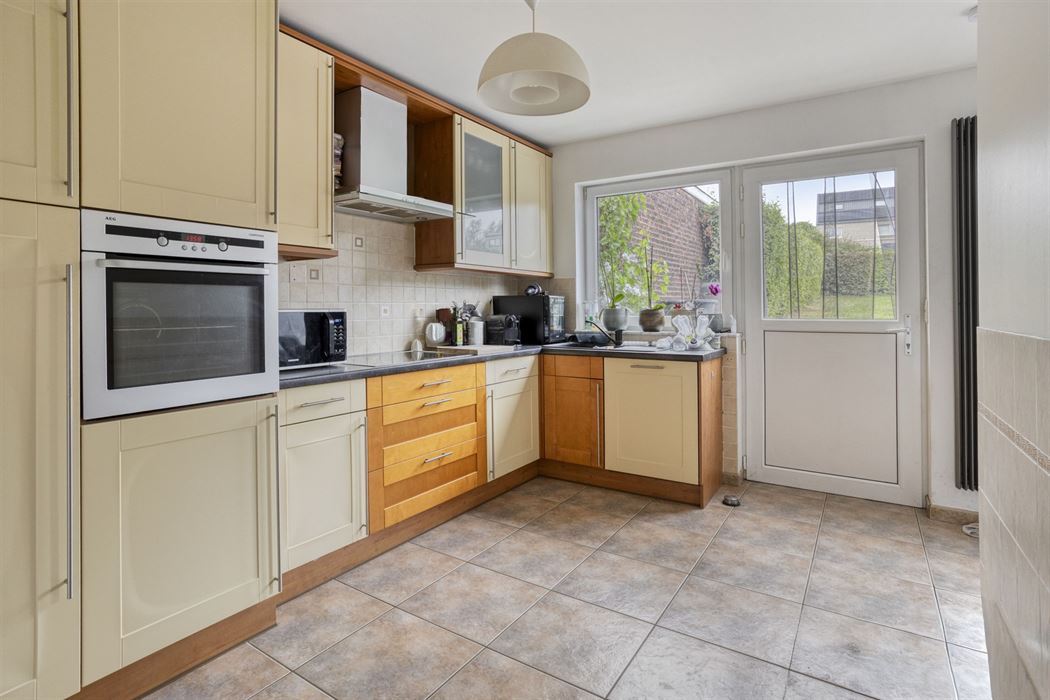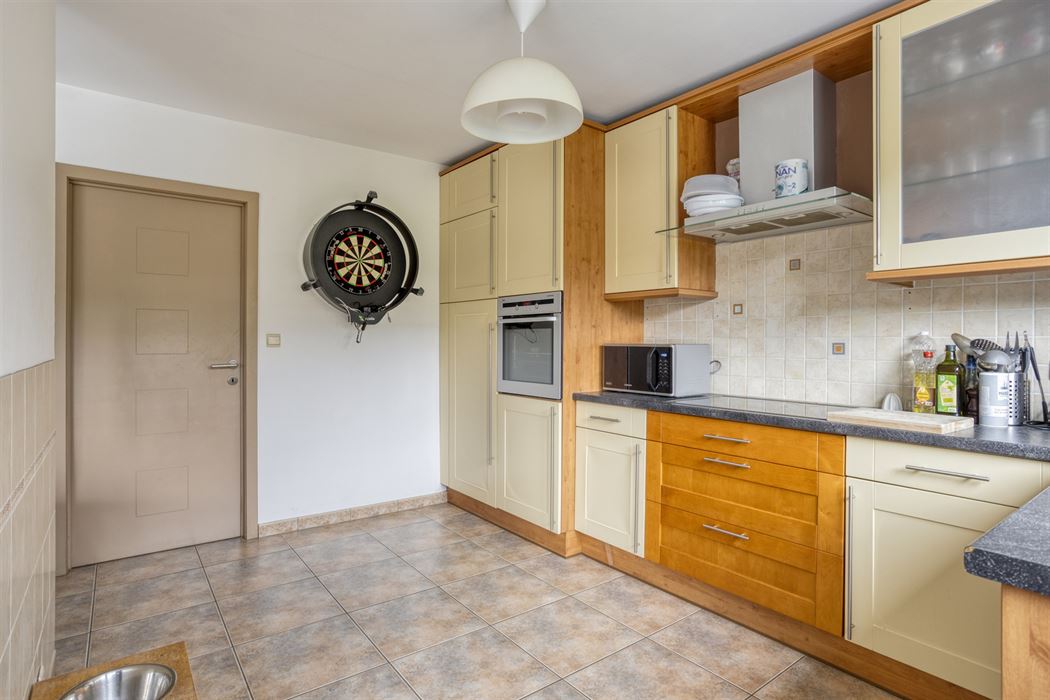 Gelijkvloers: lichtrijke inkomhal met wc, woonkamer met open ingerichte keuken. Berging en garage.